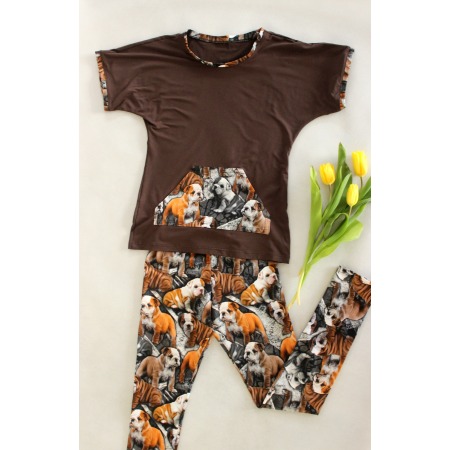 Beautiful pyjamas made of high-quality material. The top of the pyjamas is a short-sleeved blouse finished in the same pattern material as the leggings.