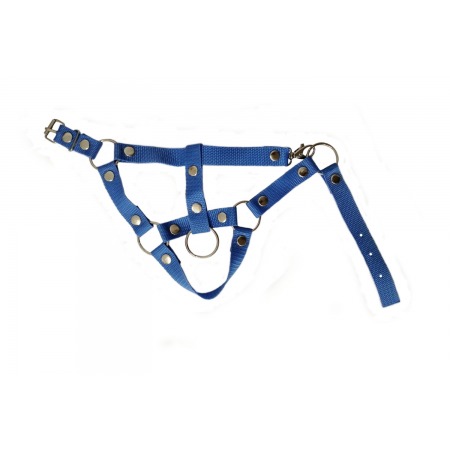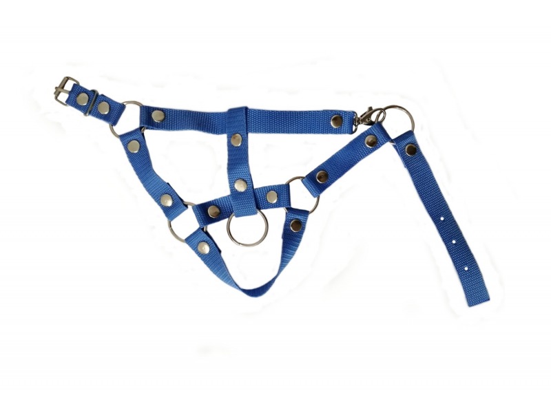 Halter made of blue webbing tape, decorated with silver snaps and rings.