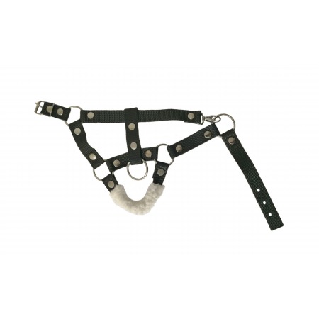 Halter made of dark grey webbing tape, decorated with silver snaps and rings.