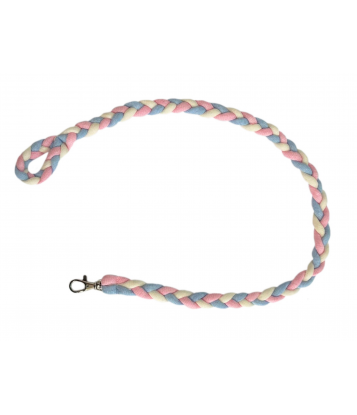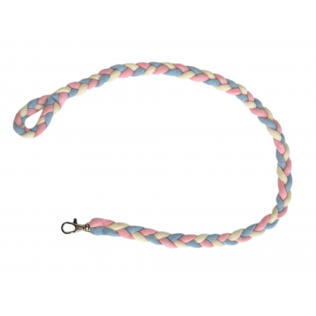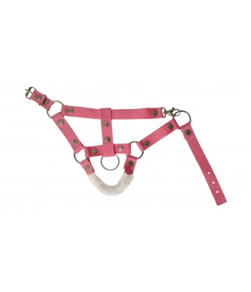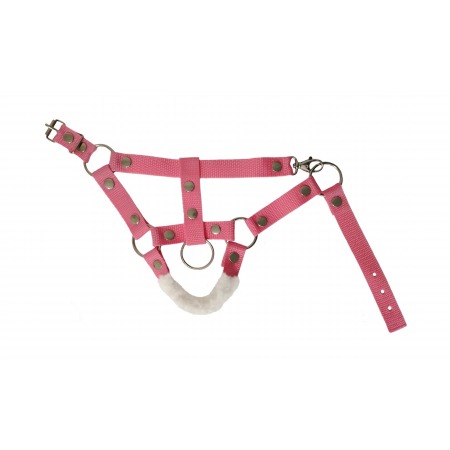 A halter is made of pink tape with the addition of fur. A leash is made of colored strings.
