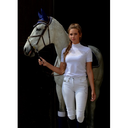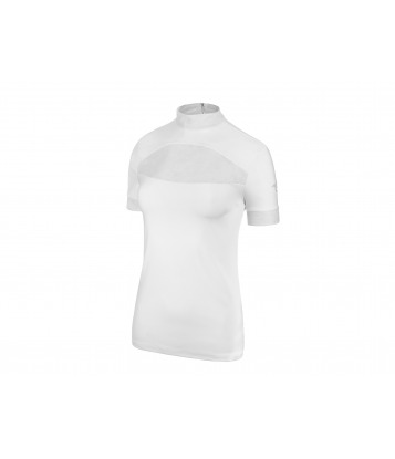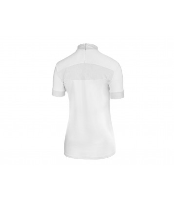 Extremely elegant competition shirt in white with a lace insert at the front and back. Made of the highest quality fabric wicking moisture. A delicate embroidery with a company logo on the left sleeve.