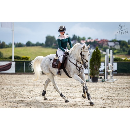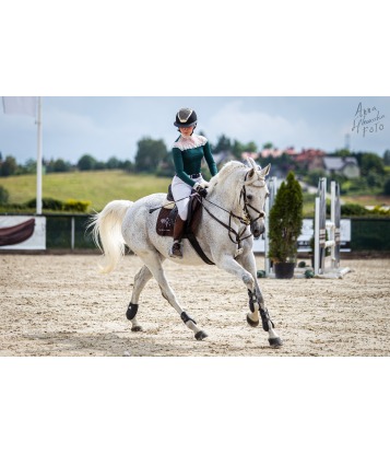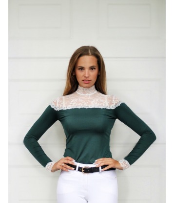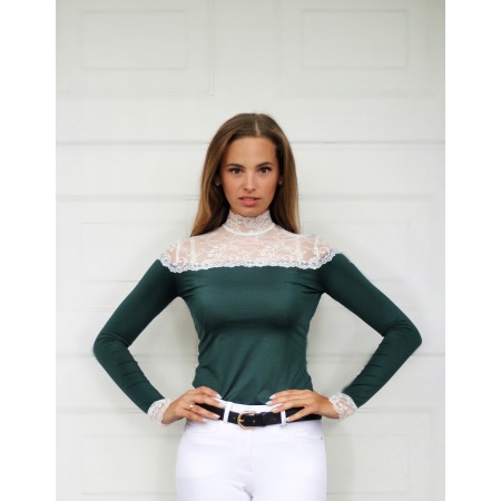 Unikalna koszula konkursowa z długim rękawem w kolorze szmaragdowej zieleni. Wykonana z technicznego materiału, który jest niezwykle funkcjonalny, oddychający, nie krępujący ruchów. Do wykończenia górnej części koszuli oraz mankietów została wykorzystana miękka i delikatnie błyszcząca francuska koronka najwyższej jakości. Na lewym ramieniu koszuli znajduje się delikatny haft. Koszula zapinana jest z tyłu na napy, pod zapięciem znajduje się ozdobne oczko.