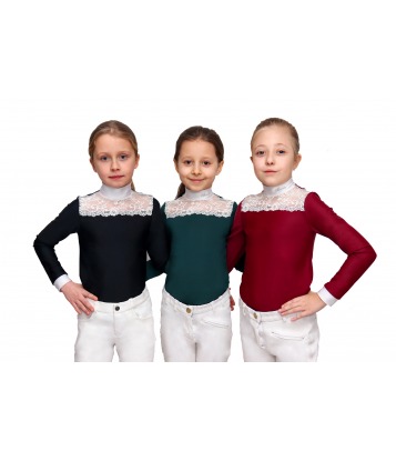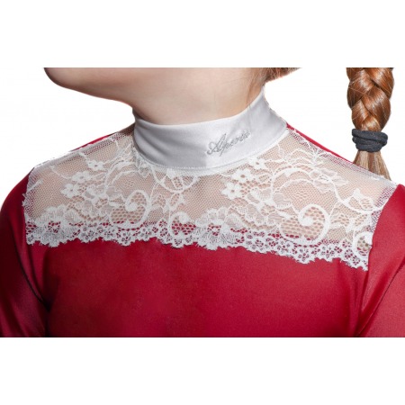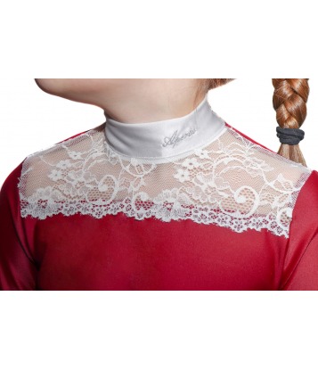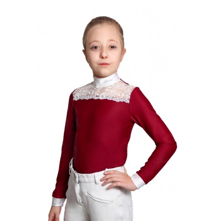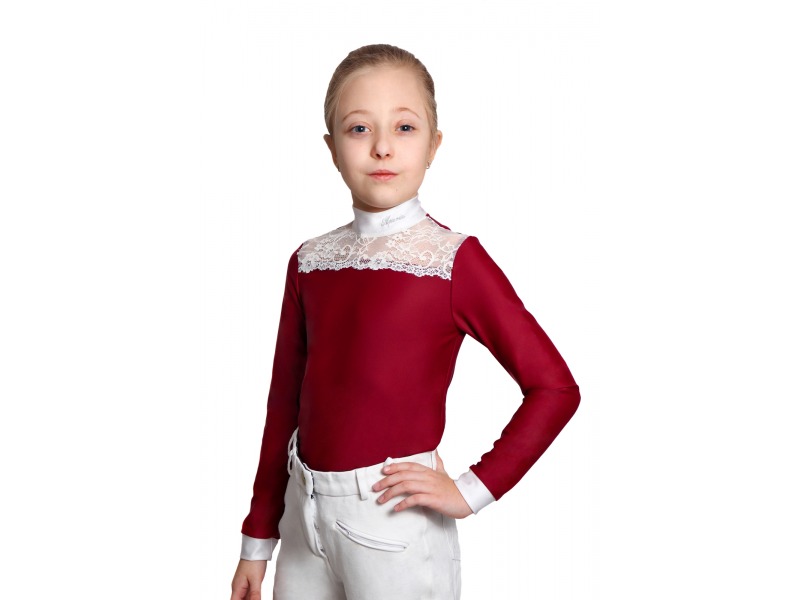 Unikalna koszula konkursowa z długim rękawem w kolorze bordowym. Wykonana z technicznego materiału, który jest niezwykle funkcjonalny, oddychający, nie krępujący ruchów. Do wykończenia górnej części koszuli oraz mankietów została wykorzystana miękka i delikatnie błyszcząca francuska koronka najwyższej jakości. Koszula zapinana jest z tyłu na napy, pod zapięciem znajduje się ozdobne oczko. Na stójce delikatny haft z logo firmy.