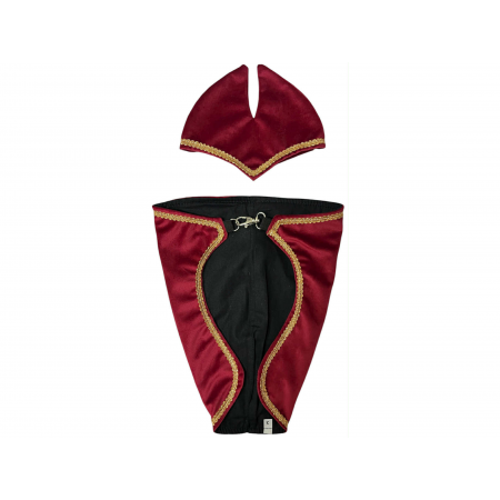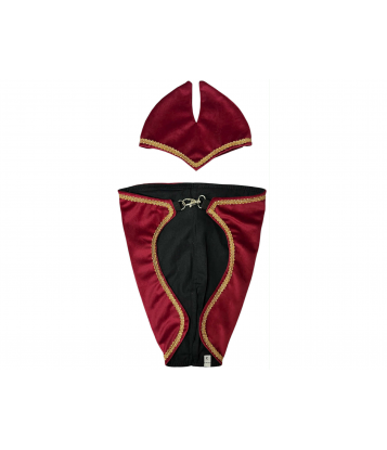 Komplet uszyty z bordowego materiału z dodatkiem lamówki.