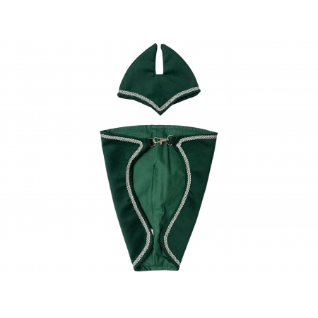 Komplet uszyty z ciemnozielonego materiału z dodatkiem lamówki.
